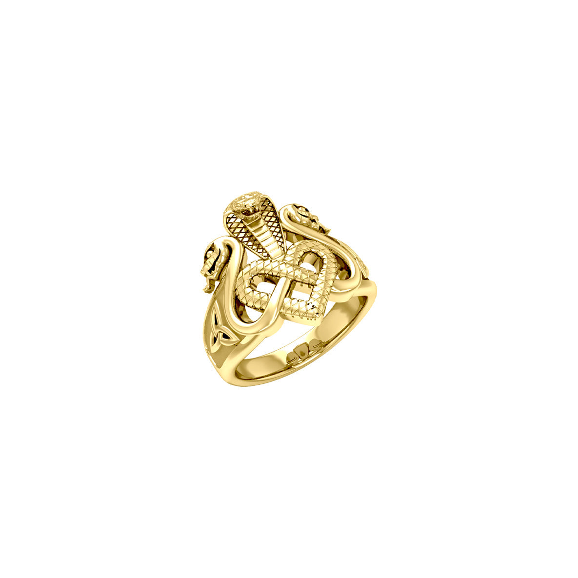 Striking and symbolic, this Triple Snake with Celtic Heart Ring captures the mystique of ancient power and eternal love. Crafted in solid Solid Gold, three intricately sculpted serpents rise in unison—the central cobra guarding the heart, flanked by two coiled vipers. The snakes weave through a textured Celtic heart knot, symbolizing unbreakable bonds, transformation, and inner strength. On each shoulder of the ring, engraved Celtic triquetra knots further emphasize timeless unity and spiritual balance. The high-polish finish contrasts beautifully with the oxidized background, enhancing every detail and adding depth to this powerful design.