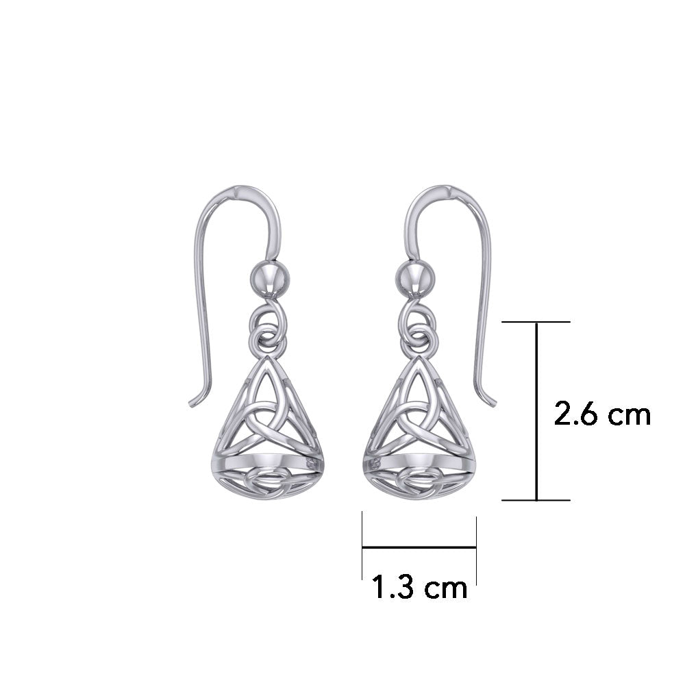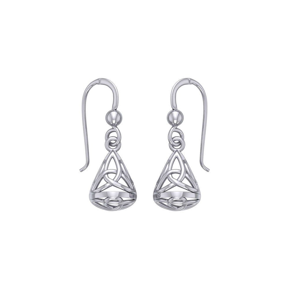 The Triquetra is an ancient Celtic symbol that speaks of the power of three in all things: earth, sea, and sky, birth, death, and rebirth, and the maiden, mother, and crone aspects of the Goddess, as well as past, present, and future. It is one of the simplest, yet most profound, of the various Celtic Knots. These Triquetra dangle earrings designed in sterling silver by Peter Stone are a stunning dimensional testament to the triplicities surrounding us.