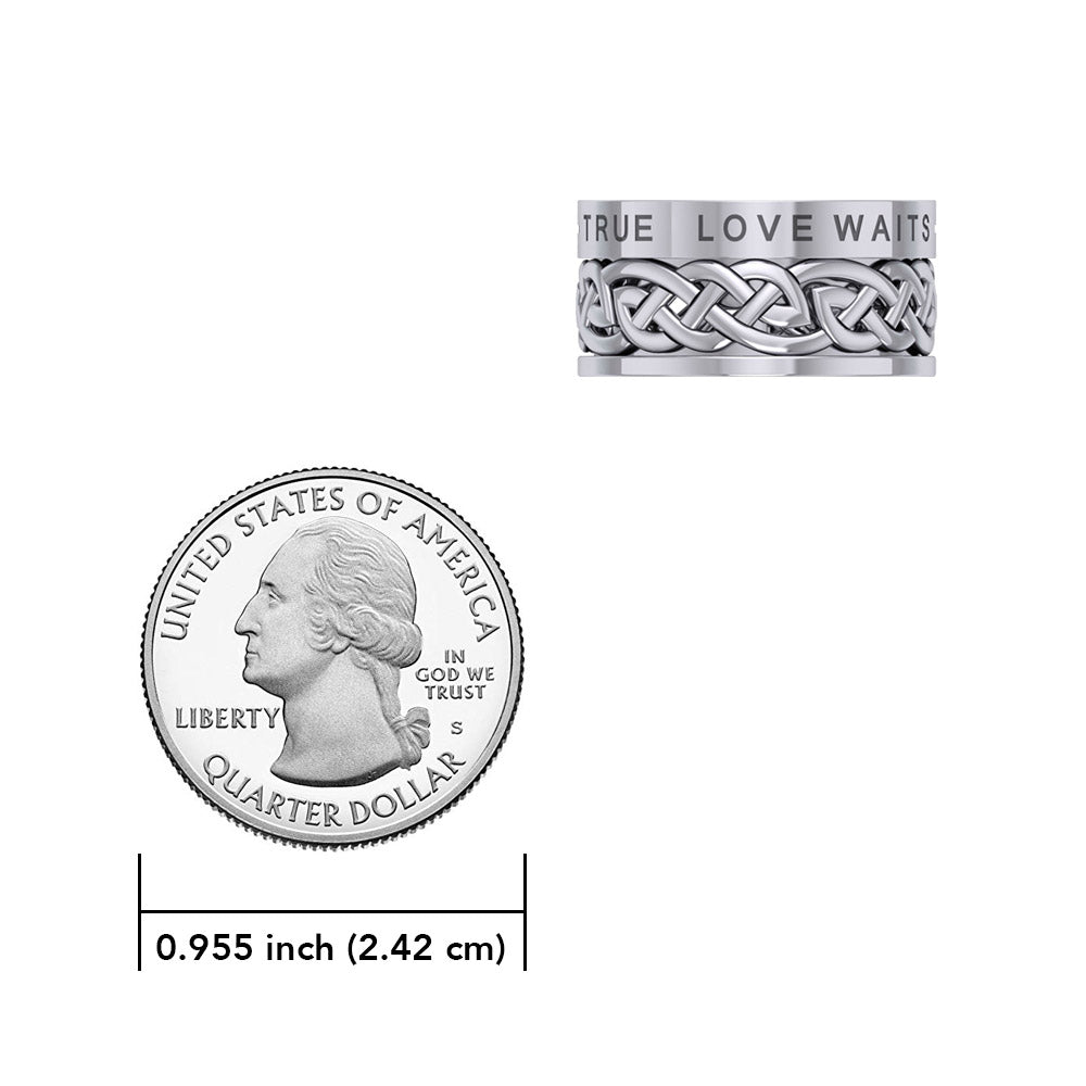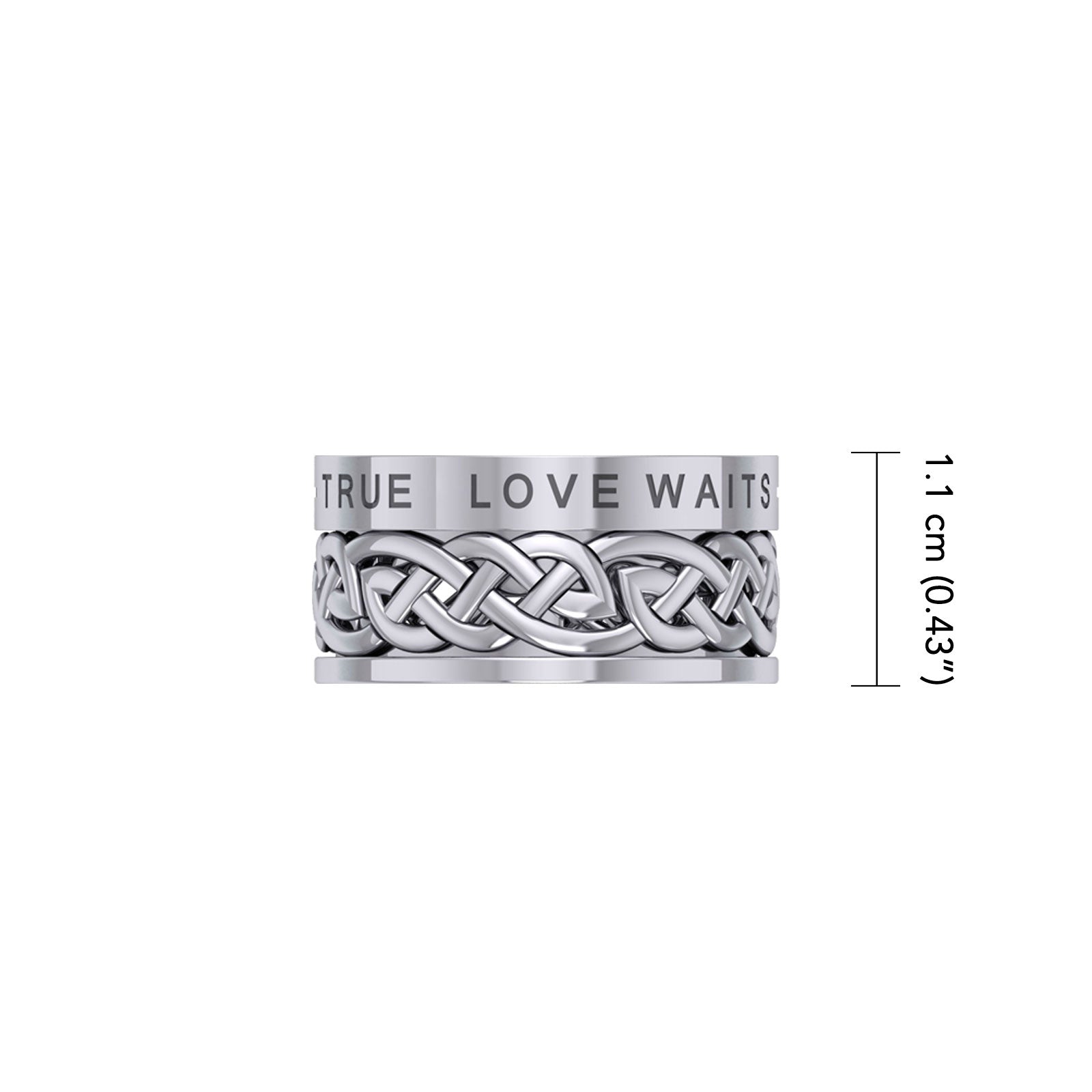 The True Love Waits Celtic Silver Spinner Ring is a unique and meaningful piece of jewelry that beautifully combines Celtic design elements with a profound message. Crafted from high-quality sterling silver, this ring features an intricate Celtic knotwork pattern that wraps around the band, symbolizing eternity and the interconnectedness of life.